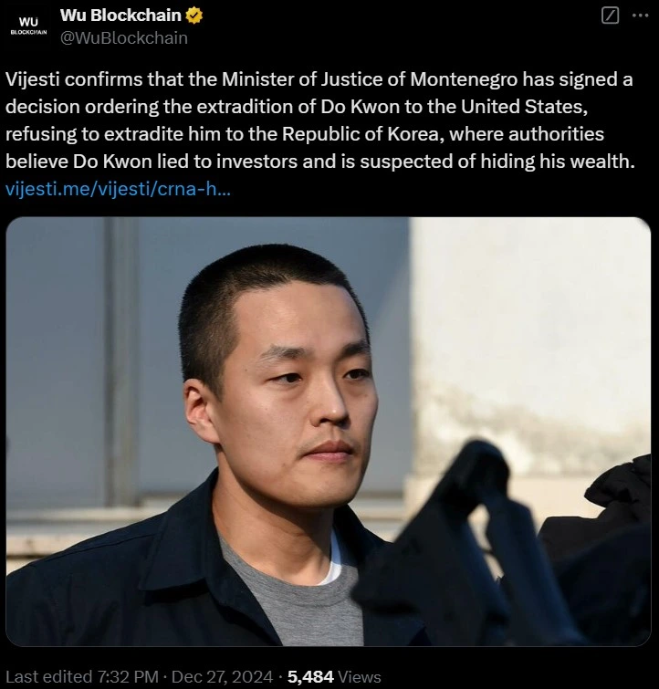 Montenegro’s Minister of Justice has officially signed a decision to extradite Terraform Labs co-founder Do Kwon to the United States. The decision was confirmed by a local news outlet Vijesti, which denied a competing extradition request from the Republic of Korea, where Kwon faces allegations of defrauding investors and concealing substantial wealth as per Wu Blockchain.