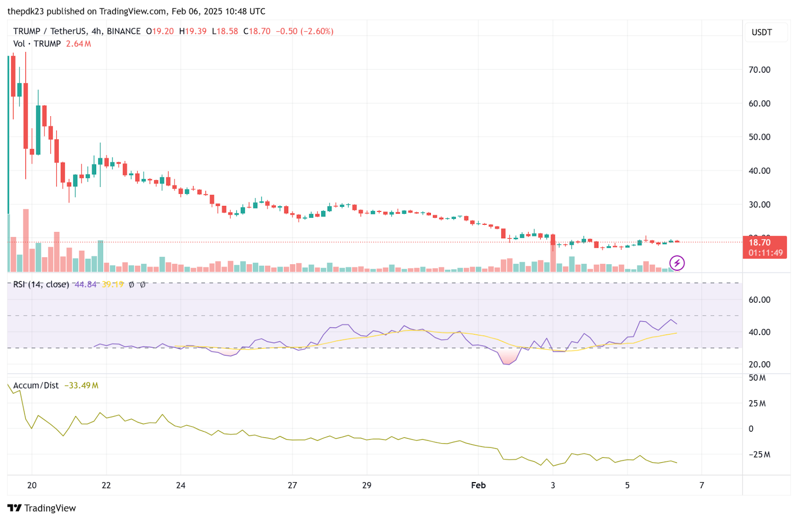 Meanwhile, the token’s accumulation has dropped sharply over the past four hours, and the chart shows no signs of short-term improvement. At press time, TRUMP was trading at $18.68, with an 18.7% surge in trading volume.