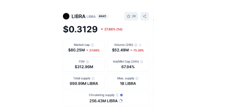 The 24-hour market volume of $LIBRA has also decreased by more than 75%, now at $52.49 million. At present, its market cap stands at $80.25 million.