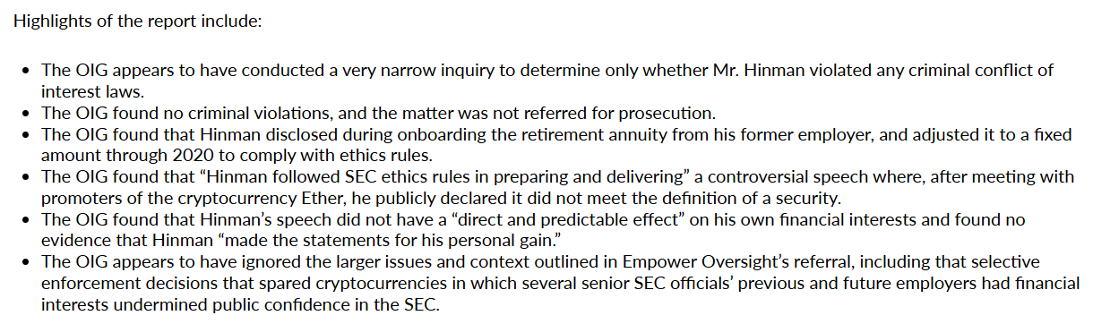 After a long legal fight, Empower Oversight received a report from the SEC’s Office of Inspector General. The report investigated whether former SEC official William Hinman had a conflict of interest when he said Ethereum was not a security.