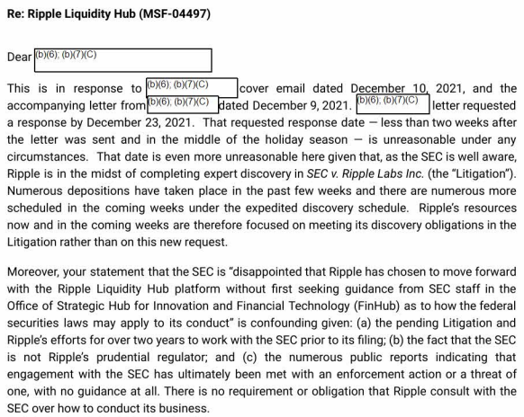 Per the letter, the SEC expressed dissatisfaction that Ripple launched Liquidity Hub without first seeking the commission’s opinion on how federal securities law may apply to the platform’s operations.