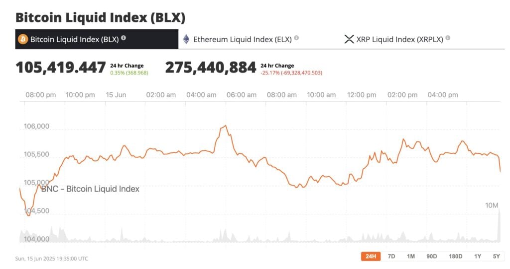 Bitcoin was steady over the weekend, unmoved by the Iran / Israel conflict, or a new Strategy Bitcoin buy, Source: BNC Bitcoin Liquid Index