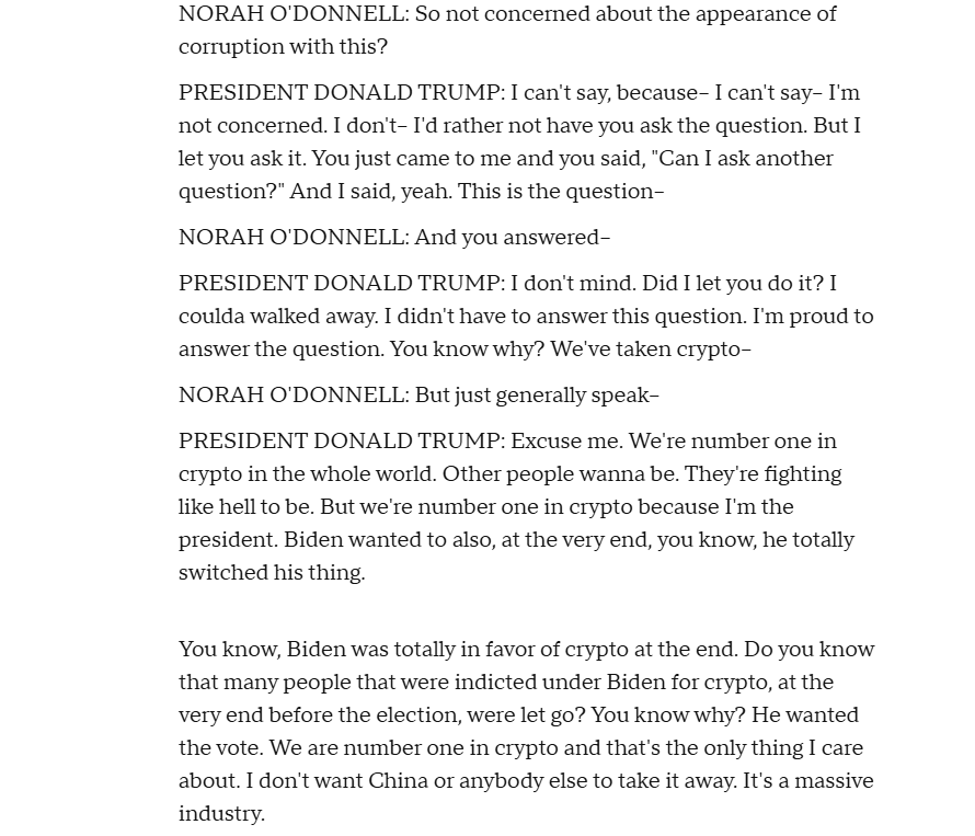 In a section of Trump’s 60 Minutes interview that was cut from broadcast, CBS’s Norah O’Donnell asked the president whether he was concerned “about the appearance of corruption,” regarding Zhao’s pardon.
