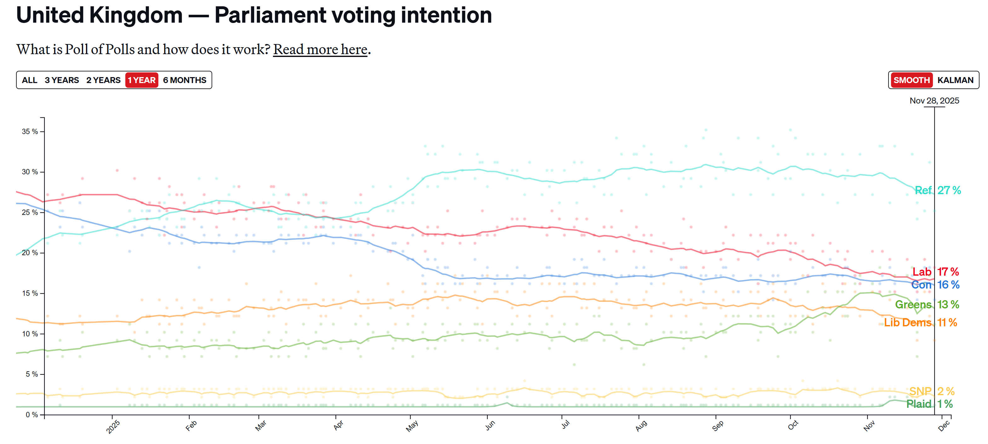 Reform UK this year became the first party to accept crypto donations. The party is leading in polls, topping opinion polls at around 27% nationally, well ahead of Labour and the Conservatives, both of which trail below 20%.