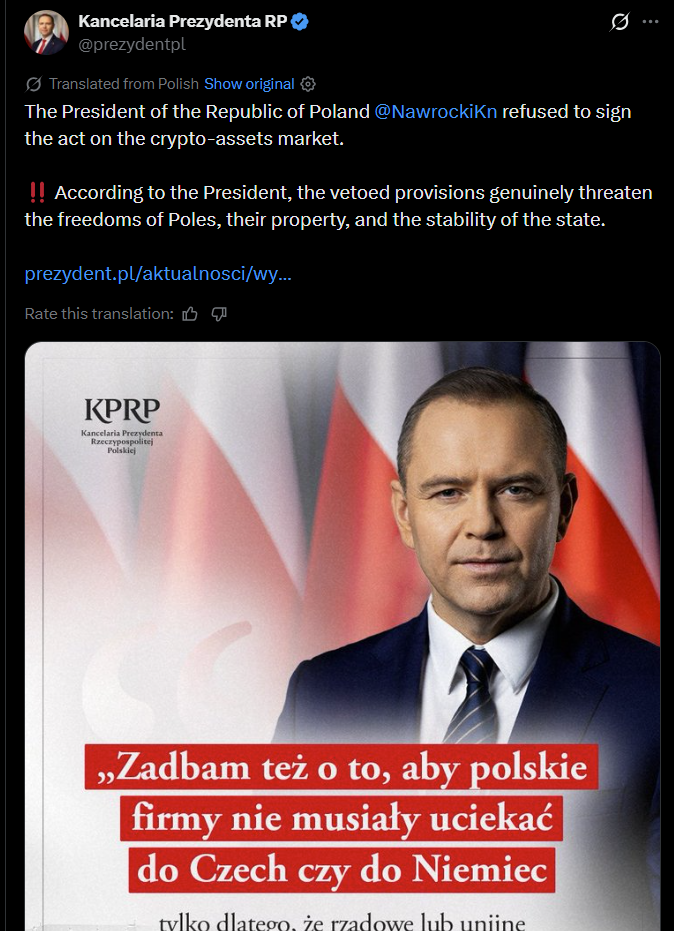 As Bloomberg reported Friday, the legislation — advanced by Prime Minister Donald Tusk’s government — was intended to align Poland with the European Union’s MiCA framework for crypto markets. The bill was introduced in June but did not survive the president’s veto.