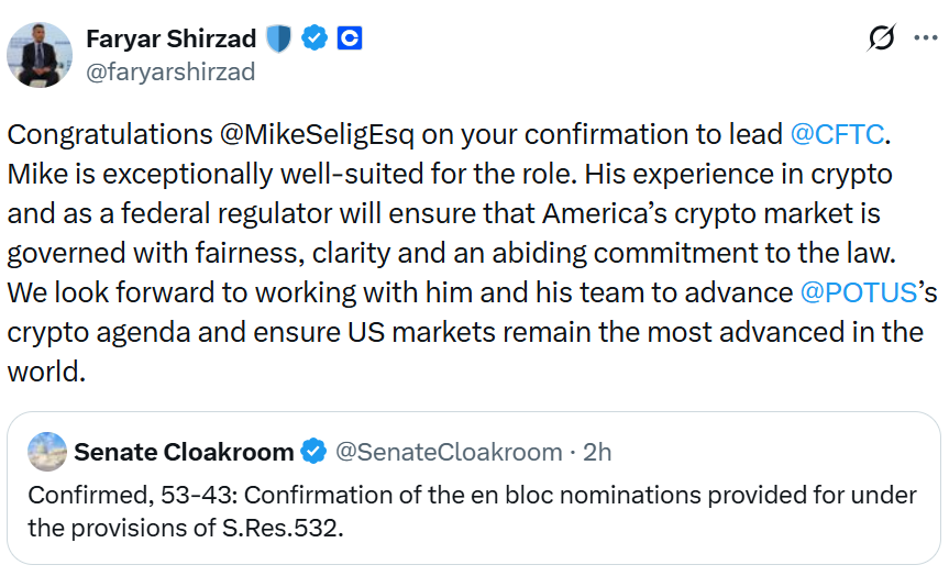 Faryar Shirzad, the chief policy officer at crypto exchange Coinbase, said in an X post that Selig’s “experience in crypto and as a federal regulator will ensure that America’s crypto market is governed with fairness, clarity and an abiding commitment to the law.”