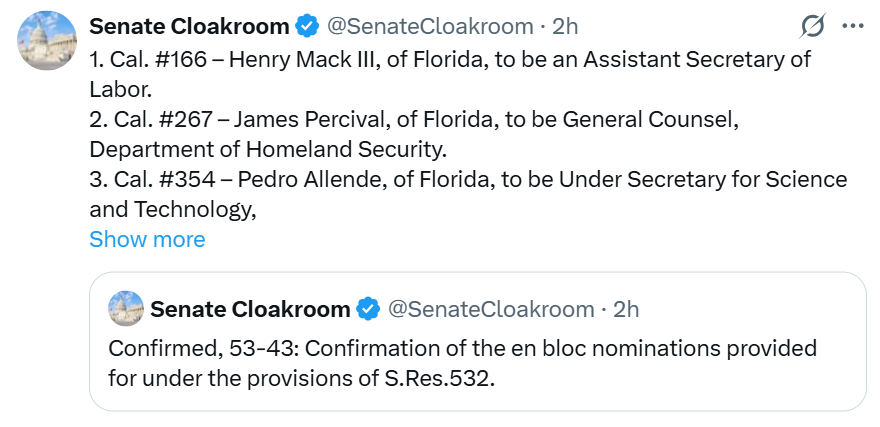 The two confirmations were included in a package of nearly 100 other nominees that the Trump administration had selected for various roles across the government, which passed the Senate in a 53-43 vote on Thursday.