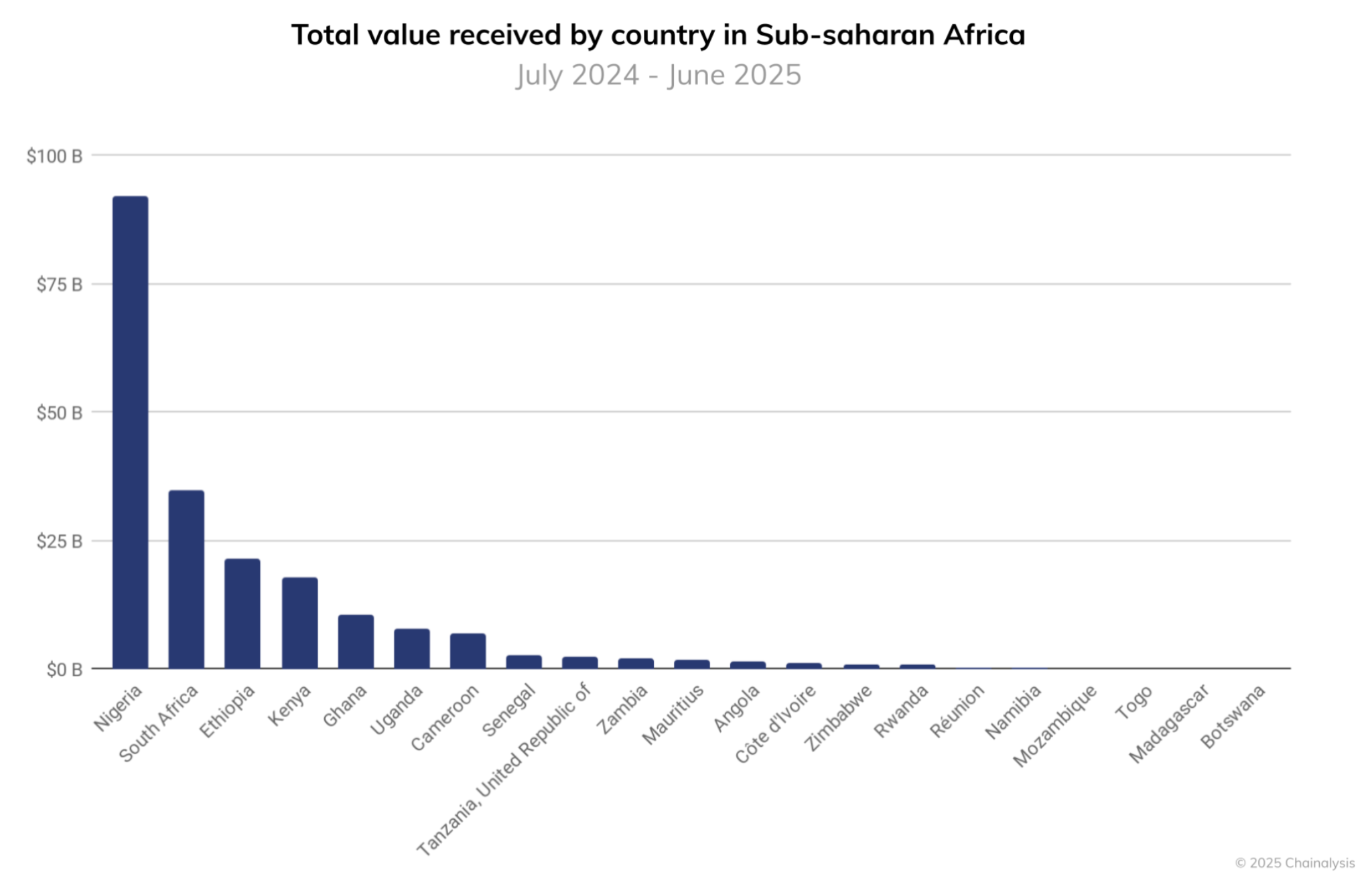 The Sub-Saharan region received over $205 billion in on-chain value, up about 52% from the previous year. This growth makes it the third-fastest growing region in the world, just behind Asia-Pacific and Latin America, according to Chainalysis.