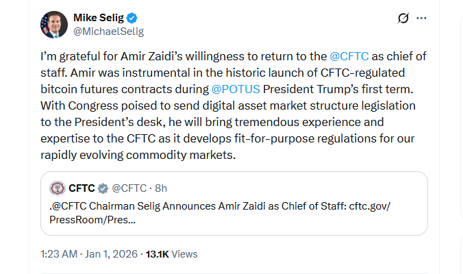 With the CFTC likely to play a key role in crypto regulation and oversight in 2026, Zaidi marks another crypto friendly figure taking up key positions in government agencies.