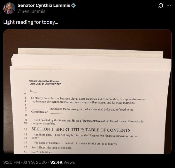 On January 8, Wyoming Senator Cynthia Lummis shared a cryptic post on X (formerly Twitter), which looks like she is reviewing an important government document. This document is none other than a draft of the Bitcoin and crypto market structure bill, which has currently sparked a discussion in the crypto community.