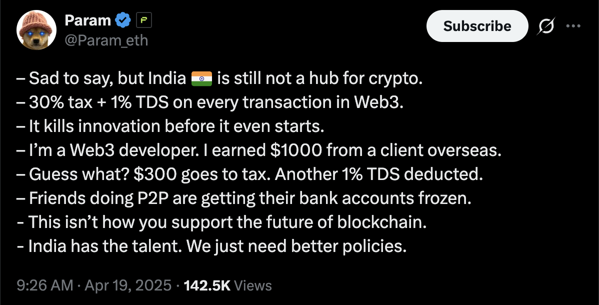 Under India’s Income Tax Act, gains from cryptocurrency sales are taxed at 30%, with users allowed to deduct only the cost basis against the gains.