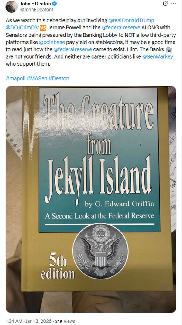 Lawyer and Senate candidate John Deaton reminded his X followers on Monday that senators are being pressured by the Banking Lobby to not allow third-party platforms like Coinbase to pay yield on stablecoins.