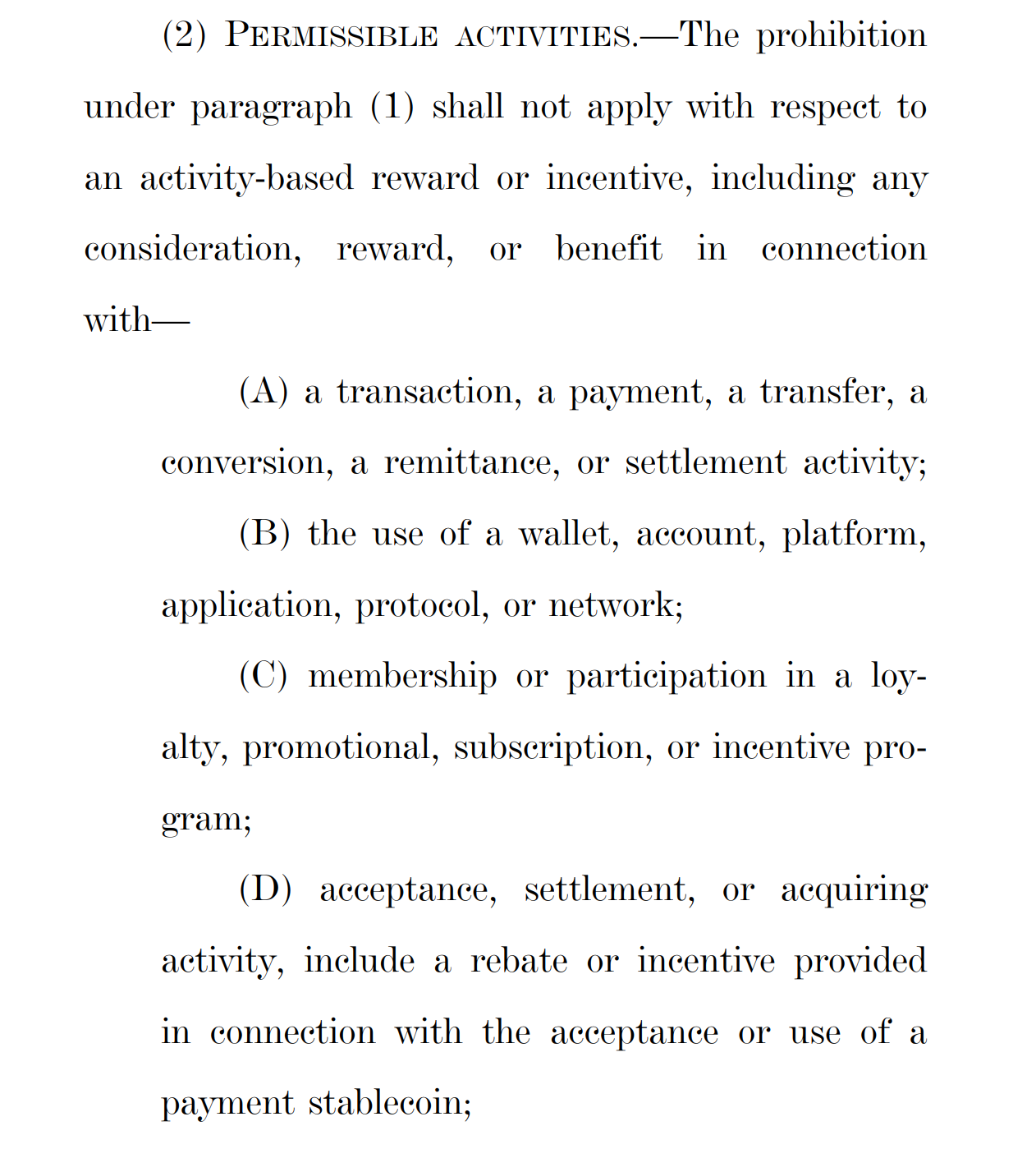 Under the draft, the prohibition would not apply to incentives connected to everyday financial activity. These include rewards linked to payments, transfers, remittances and settlements, as well as benefits tied to the use of wallets, accounts, platforms or blockchain networks. Loyalty and promotional programs, subscription-based incentives, and rebates related to the use of stablecoins are also covered.