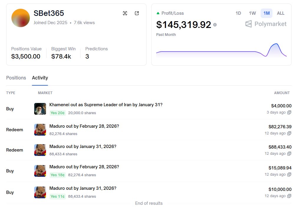 The trader retained one active prediction on “Khamenei out as the Supreme Leader of Iran by January 31.” The market is trending, with over $28M in volume. The Sbet365 wallet has been buying ‘yes’ tokens at $0.20 on average, preparing for a big gain in the case of a resolution.