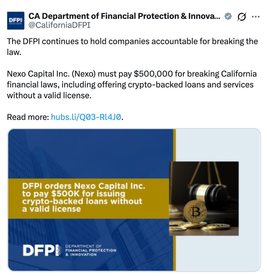 The California Department of Financial Protection and Innovation (DFPI) said on Wednesday that Nexo made at least 5,456 consumer and commercial loans to Californians without a valid license.