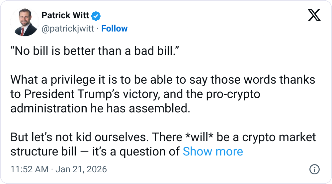 “There *will* be a crypto market structure bill — it’s a question of when, not if,” Patrick Witt, the executive director of the President’s Council of Advisors for Digital Assets, said on Tuesday.