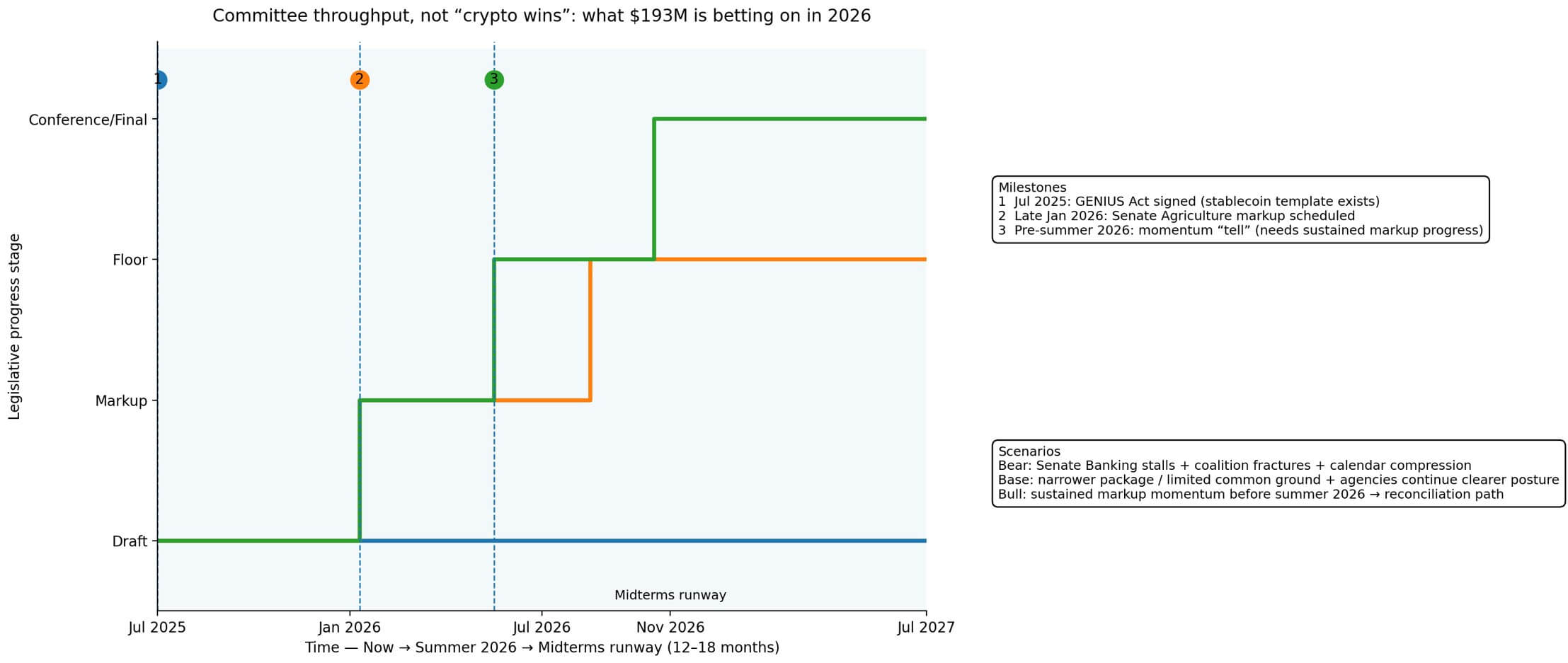 A base case sees partial clarity, with agency rulemaking accelerating: one chamber moves a narrower market-structure package or reconciles around limited common ground, and agencies proceed with a clearer crypto posture under current leadership, reducing enforcement ambiguity even without a grand bargain.