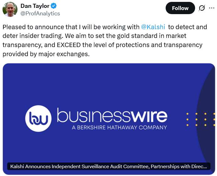 Alongside Wharton’s Taylor, Kalshi’s surveillance committee also includes Lisa Pinheiro, a managing principal and data scientist focused on market manipulation at Analysis Group. Kalshi’s lawyer, Robert DeNault, was also appointed to head of enforcement to coordinate with the new committee.
