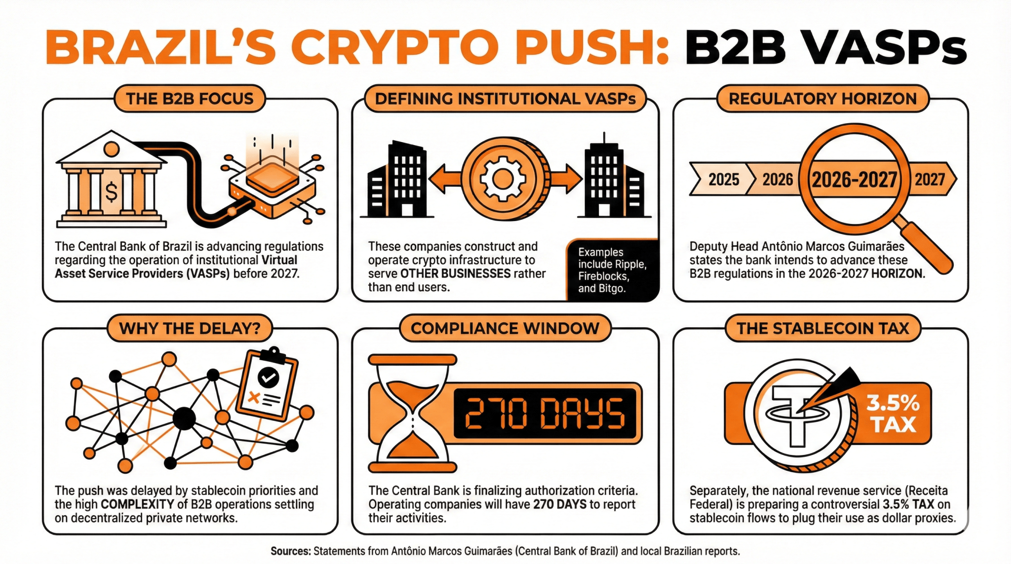 Deputy head Antônio Marcos Guimarães indicated that the regulation of institutional VASPs is expected to progress during the 2026-2027 timeframe. -