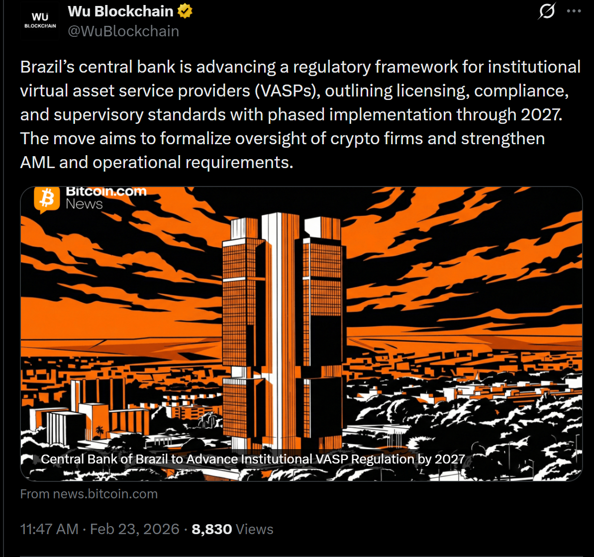 - Brazil's Central Bank to regulate institutional crypto firms by 2027, focusing on licensing and compliance.