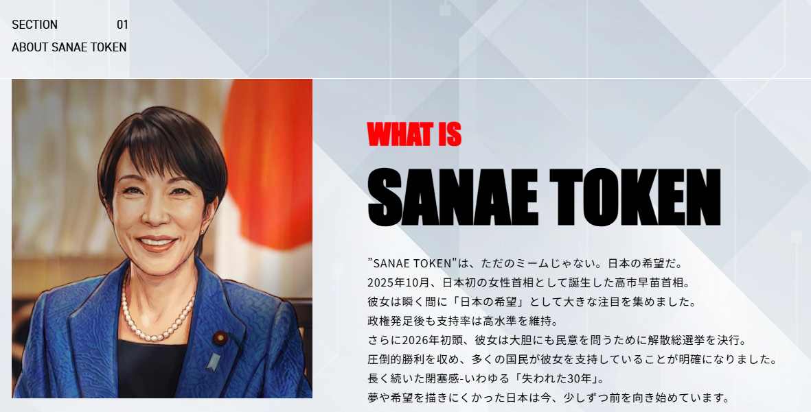 SANAE TOKEN launched on the Solana blockchain on Feb. 25 without the prime minister’s knowledge. Serial entrepreneur Yuji Mizoguchi’s NoBorder DAO community issued it as part of a “Japan is Back” initiative. The project’s website displayed Takaichi’s name and an illustrated portrait of her.