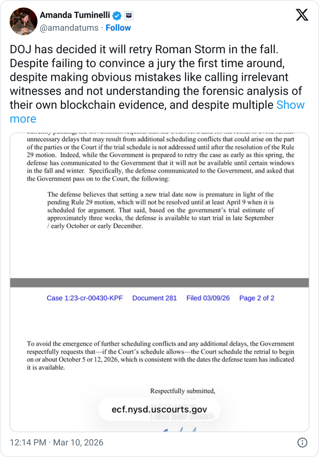 “Despite failing to convince a jury the first time around, despite making obvious mistakes like calling irrelevant witnesses and not understanding the forensic analysis of their own blockchain evidence, and despite multiple legal and logical fallacies to their allegations of third-party dev liability, the SDNY will retry Roman Storm,” she added.