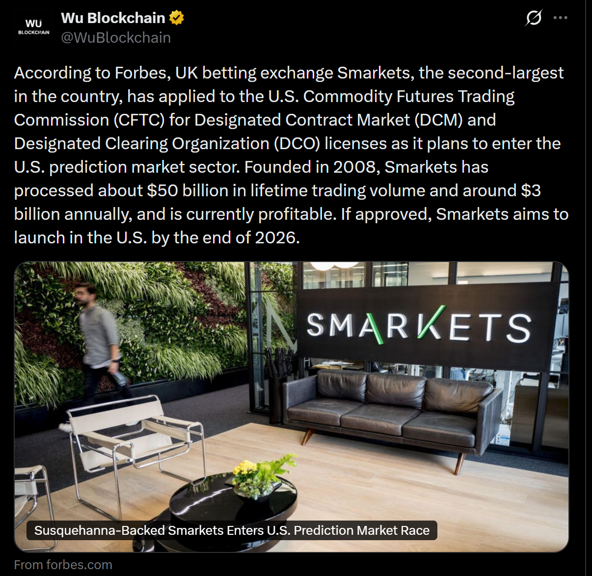 Assuming that its proposal is approved, Smarkets anticipates opening its prediction market platform in the U.S. by the end of 2026, and this will bring it to a fast-changing industry where traders bet on the likelihood of real-world events, such as elections, or economic indicators. The relocation puts the London-based exchange and a wider number of fintech companies that are seeking regulatory permission to conduct prediction markets in the U.S. derivatives system.