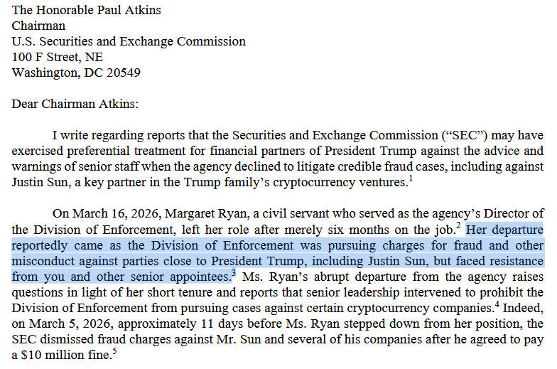 “Reports that Judge Ryan was not given the latitude to enforce the law against allies of President Trump fit into a broader narrative that has marked your tenure as SEC Chair: if you have the ability to pay or have connections to the President, you can act with impunity.”