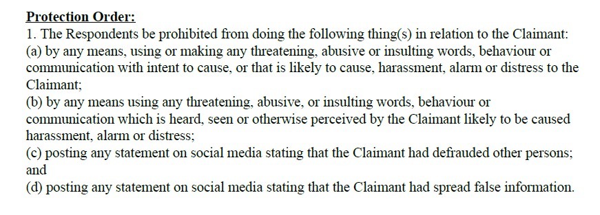 The court order bars threatening, abusive or insulting communications and requires the respondents to pay a total of 2,500 Singapore dollars (about $1,900) in compensation and costs by April 7.