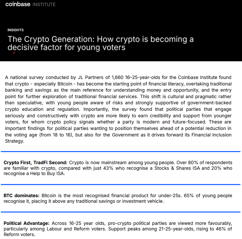 Nearly half of young people said they would trust a political party more if it showed an understanding of crypto and blockchain technology, while 26% said they were more likely to support one that backed pro-innovation crypto policy. More under-25s now recognize Bitcoin than any ISA, savings bond or other legacy savings product, with 65% awareness making $BTC the most recognized financial product among this group.