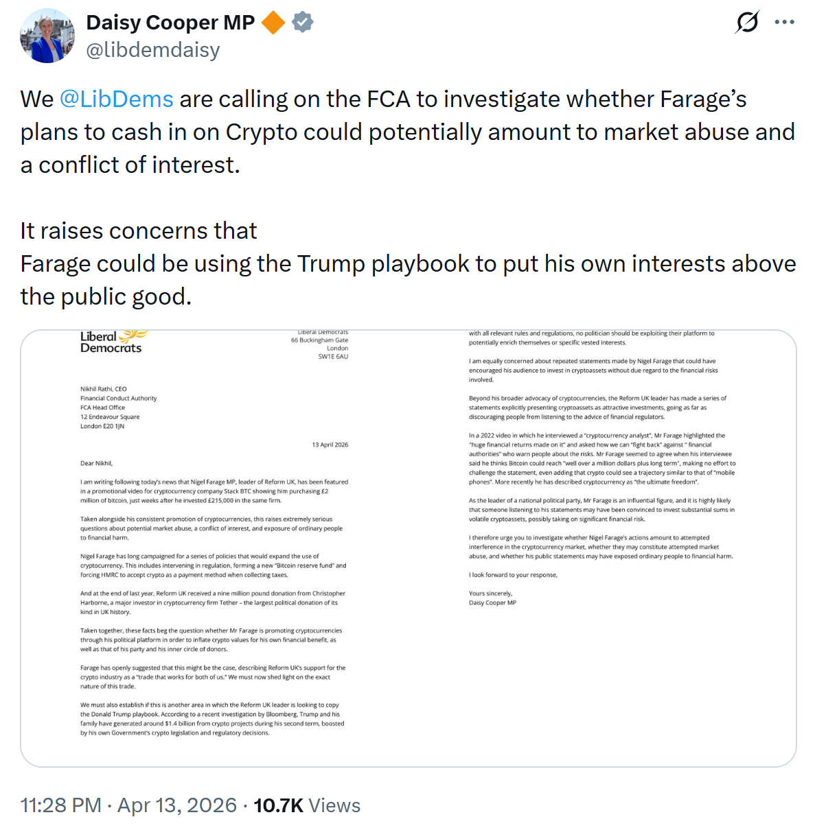 In a letter to the FCA, Liberal Democrat deputy leader Daisy Cooper asked the regulator to investigate whether Farage breached market rules by appearing in a promotional video for Stack $BTC while holding a financial stake in the company.