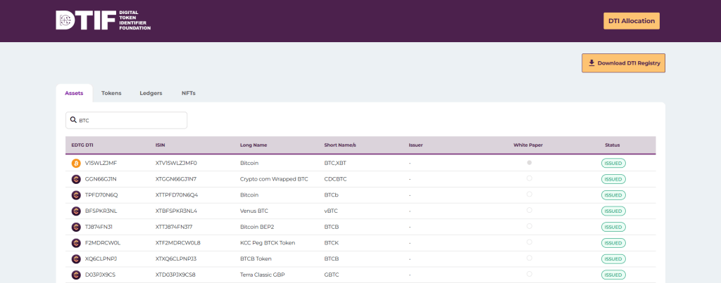 The second is the Digital Token Identifier (DTI), an ISO 24165 code that identifies the crypto-asset itself, maintained in the DTIF registry. Article 15 of the record-keeping RTS and Article 3 of the white paper classification RTS (Commission Delegated Regulation EU 2025/421) require its use. The operative point for any project launching a new token: if the DTI does not yet exist in the registry, someone must request its creation before the white paper can be submitted. Where a CASP is filing for an asset with no centralized issuer and no existing white paper, the platform is responsible for retrieving or requesting the DTI directly from the DTIF.
