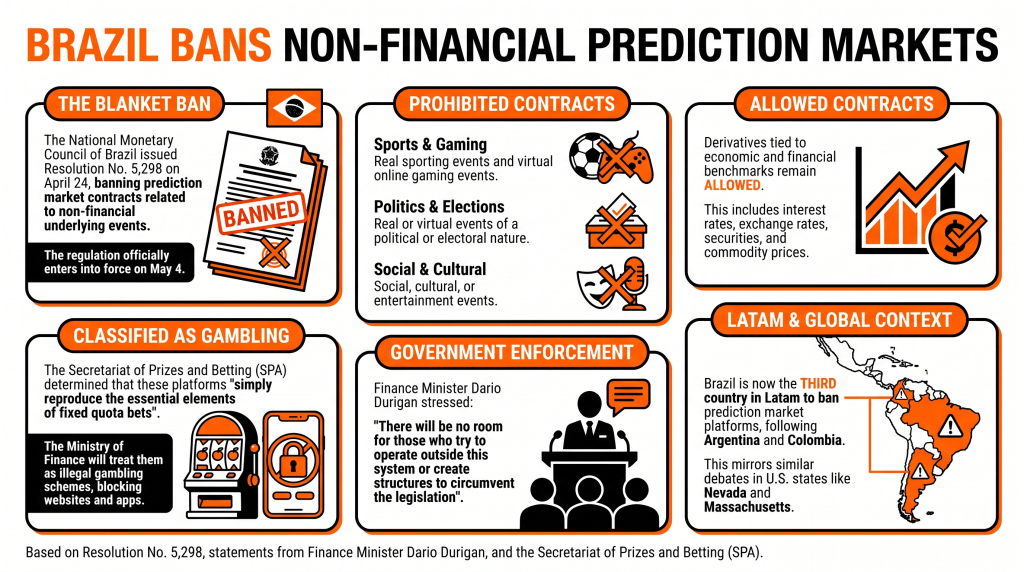 - Brazil’s National Monetary Council banned non-financial prediction markets on April 24 via Resolution 5,298.