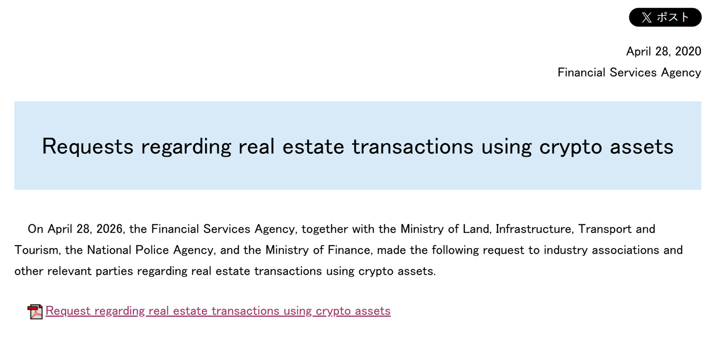 Japan sends request regarding crypto usage in property deals. Source: FSA