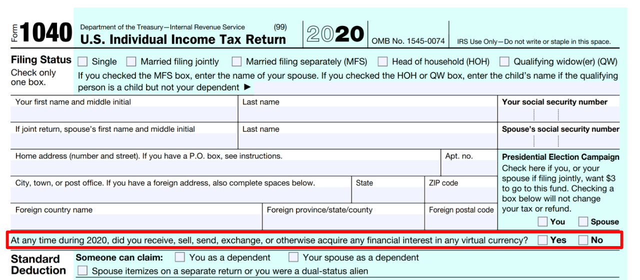 The first question on Form 1040 is about cryptocurrency. It reads: “At any time during 2020, did you receive, sell, send, exchange, or otherwise acquire any financial interest in any virtual currency?” Taxpayers only need to answer “yes” or “no” to this question.