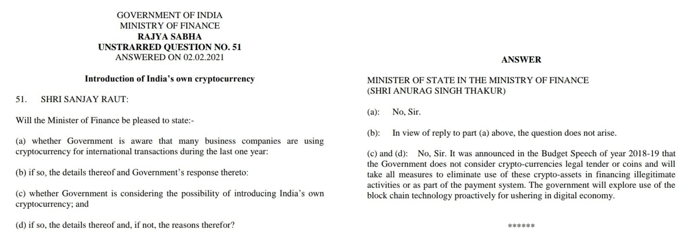 Rajya Sabha, the upper house of India’s parliament, published a list of questions and written answers on Feb. 2 that include the topic entitled the “Introduction of India’s own cryptocurrency.”