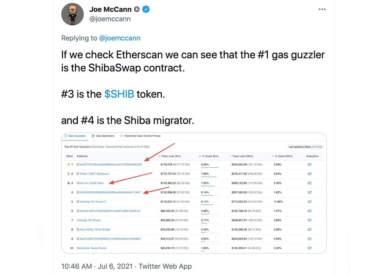 The director of research at the Block Crypto, Larry Cermak tweeted about Shibaswap and fees on July 6. “Gas is near 100 again as Shibaswap starts taking off and spamming Ethereum’s blocks. We live in a clown world,” Cermak wrote.