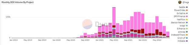 While this statistic may seem high compared to volume recorded by competing exchanges such as ShibaSwap, 1inch limit order protocol, Ox Native, and mStable, it was a 17% decrease from June.