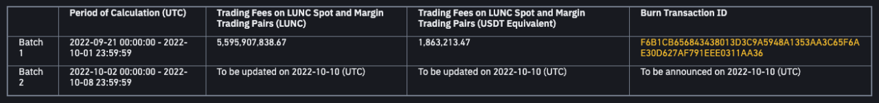 “In response to the LUNC community proposal on burning trading fees while maintaining a good trading experience for users, Binance will implement a burn mechanism to burn all trading fees on LUNC spot and margin trading pairs by sending them to the LUNC burn address. The specific amount of LUNC to be burned, its equivalent value in USDT, and on-chain transaction ID will be updated each week in this announcement until further notice.“
