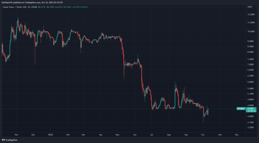 Huobi’s native token, HT, has spiked over the past three hours, climbing 5% to trade at $4.30 at the time of writing, according to CoinGecko. HT has also been flat over the past three months and is down 89% from its May 2021 all-time high.