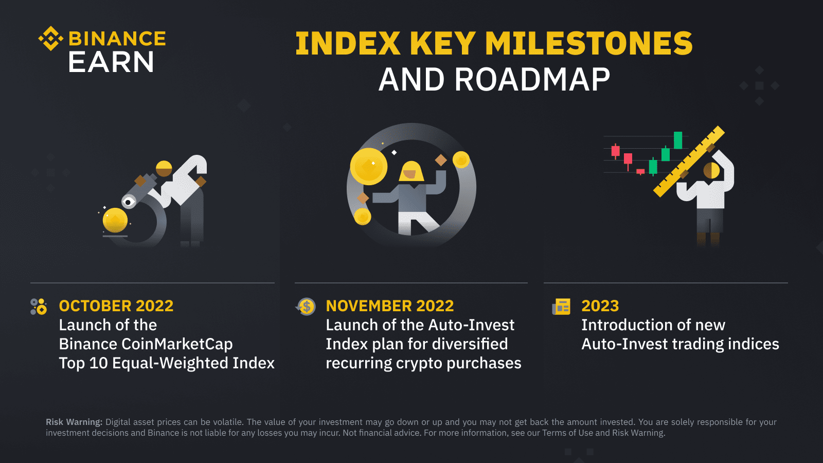 The first way to purchase digital assets/currencies in this new index will be via Auto-Invest,which allows users to automate cryptocurrency purchases via Dollar-Cost Averaging (DCA). This will be available from November 2022, and users will be able to make recurring purchases for cryptocurrencies on the Binance CMC Top 10 Equal-Weighted Index via Auto-Invest. The specific launch time will be announced at a later date.