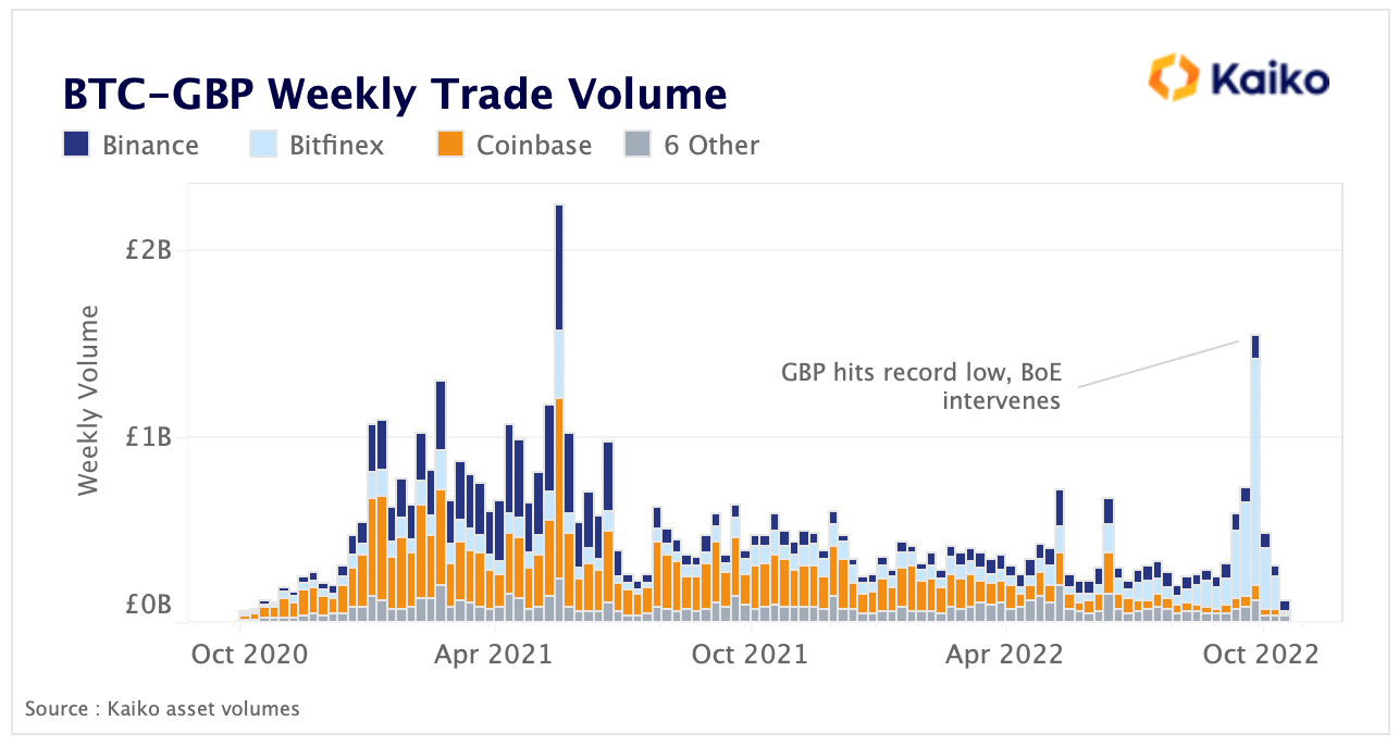 Binance and Coinbase, for example, actually saw a strong decline in BTC-GBP volumes according to Kaiko’s data, with their combined market share plummeting from 80% in mid-2021 to about 30% currently.