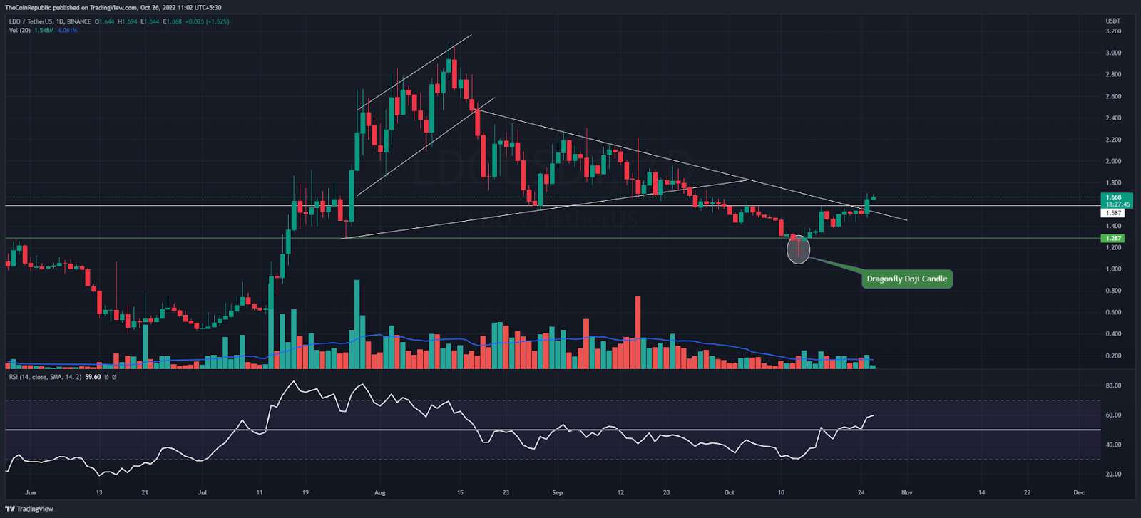 On 1 October, the TON crypto bottomed out as the daily price candle drew the Dragonfly Doji candle. Later on, assets continue increasing higher in the chart, although there are some little price corrections in lower-time frames. Amid uptrend, digital assets breached the descending trendline (white) and price is well staying above this zone.