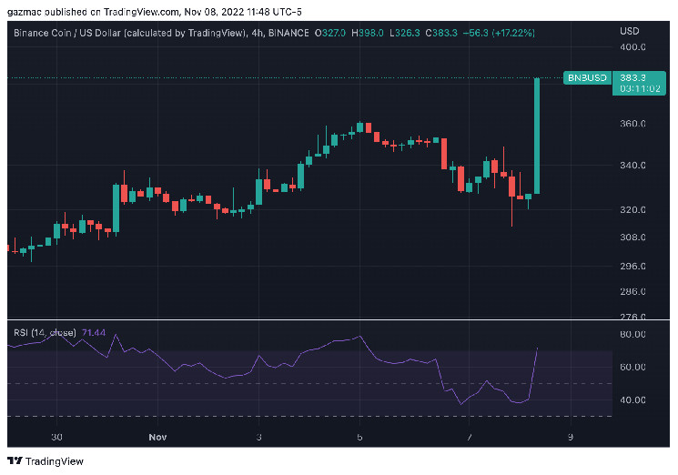 However it is BNB that is the main beneficiary. The exchange coin is up 13.5% at $386 as traders pile into the asset class.
