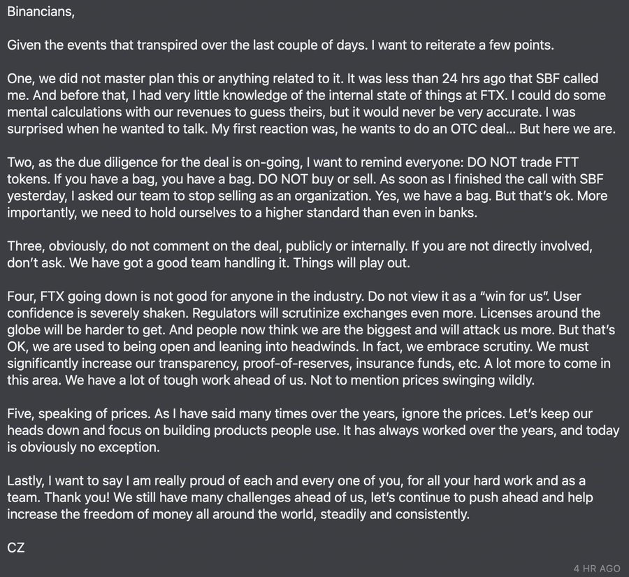 Binance CEO Changpeng “CZ” Zhao has revealed a note sent to the Binance team across all countries, as he asks the team not to trade FTT amidst proceedings of the FTX buyout deal.