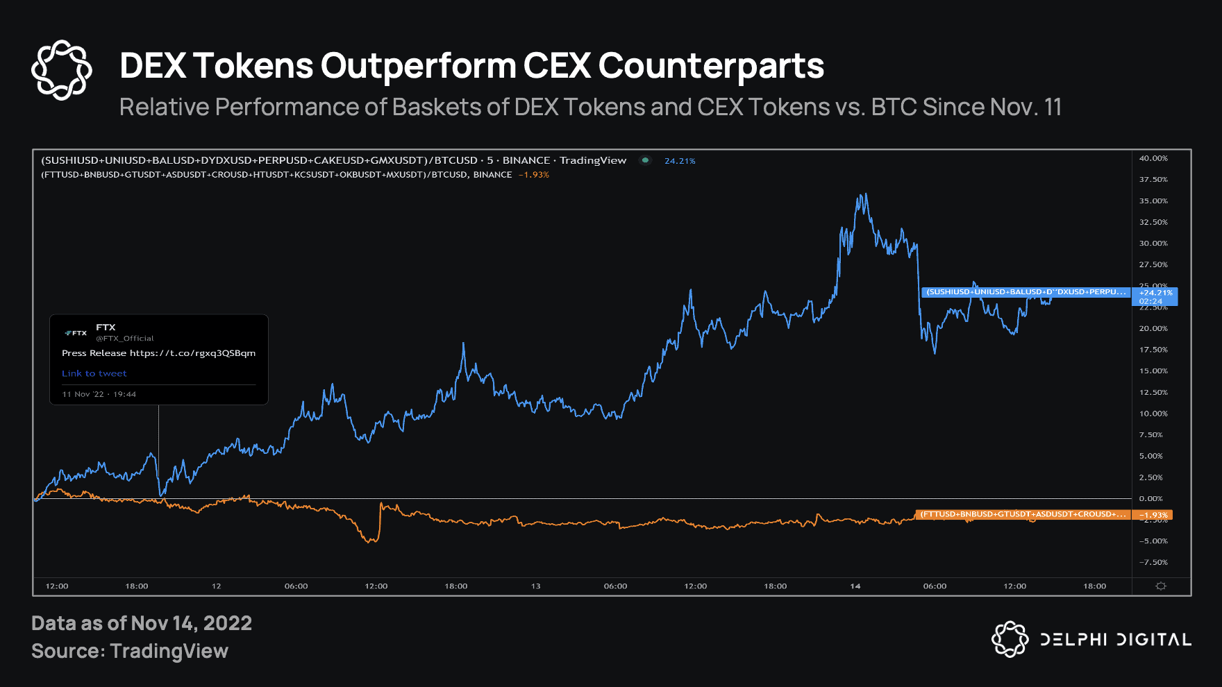 As a result of this spike in self-custody and decentralized finance, DEX tokens are also on the upswing. According to Delphi Digital, the DEX basket of tokens is up by +24% vs. the equivalent CEX basket, which is down by -2% since November 11th.
