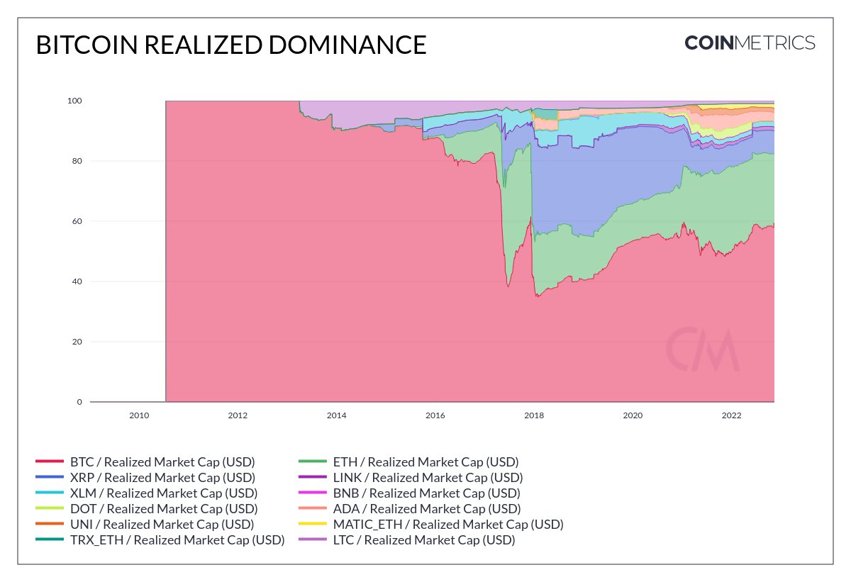 Likewise, Josef Tetek, Bitcoin analyst at Trezor reported an exponential rise in sales since November 7th. Predictably, Bitcoin dominance is also on the rise, just as it was after the Terra meltdown. If one excludes manipulative centralized tokens like FTX (FTT) and non-crypto stablecoins, Bitcoin’s realized dominance is at an all-time high since December 2017, at 59%.
