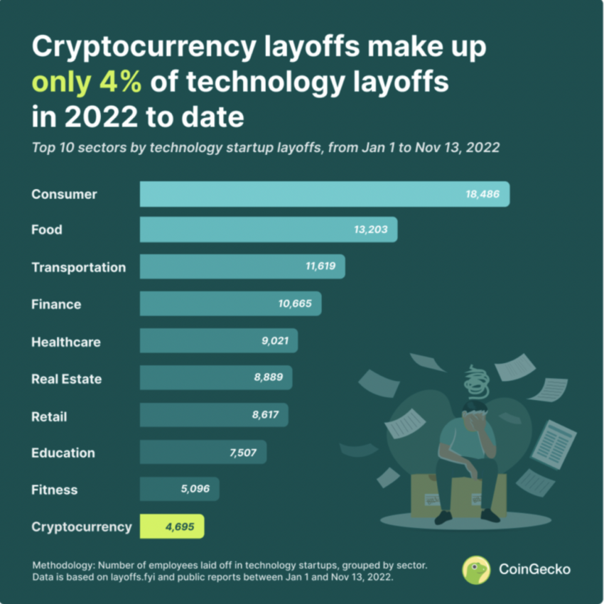 According to a CoinGecko report released on Nov. 14, the crypto sector saw 4,695 layoffs, which comprise 4% of the entire tech industry.