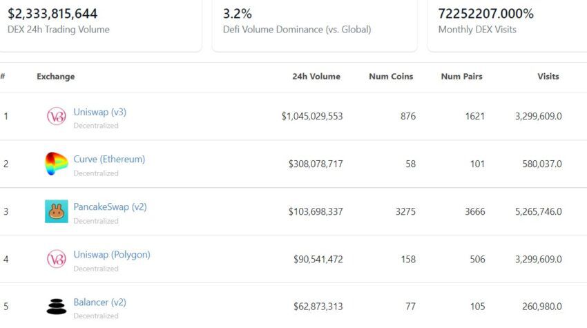 While the decentralized Uniswap exchange is a bit lower on the list, it tops the ranks of decentralized trading platforms. Uniswap currently has the highest 24h trading volume of any decentralized crypto exchange, coming in at $2.3 billion.
