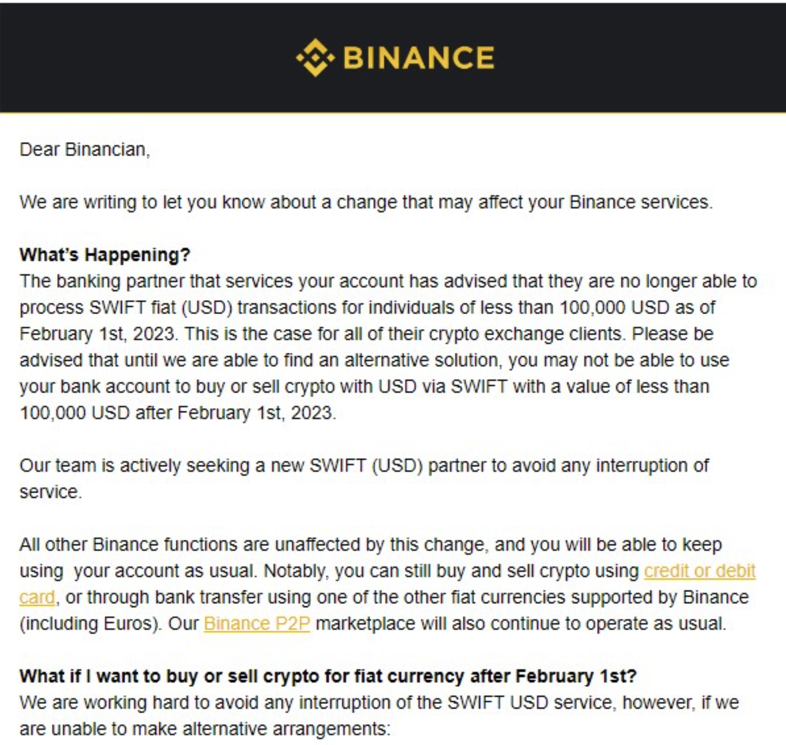 Binance informed its clients of the new policy in an email sent out to affected users, where it also said that Signature Bank’s new policy will apply to all of its crypto clients. It added that it is “actively seeking” a new partner to process its SWIFT payments.